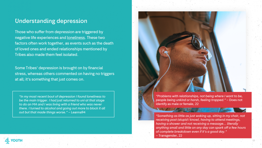 Those who suffer from depression are triggered by negative life experiences and loneliness. These two factors often work together, as events such as the death of loved ones and ended relationships mentioned by Tribes also made them feel isolated.
